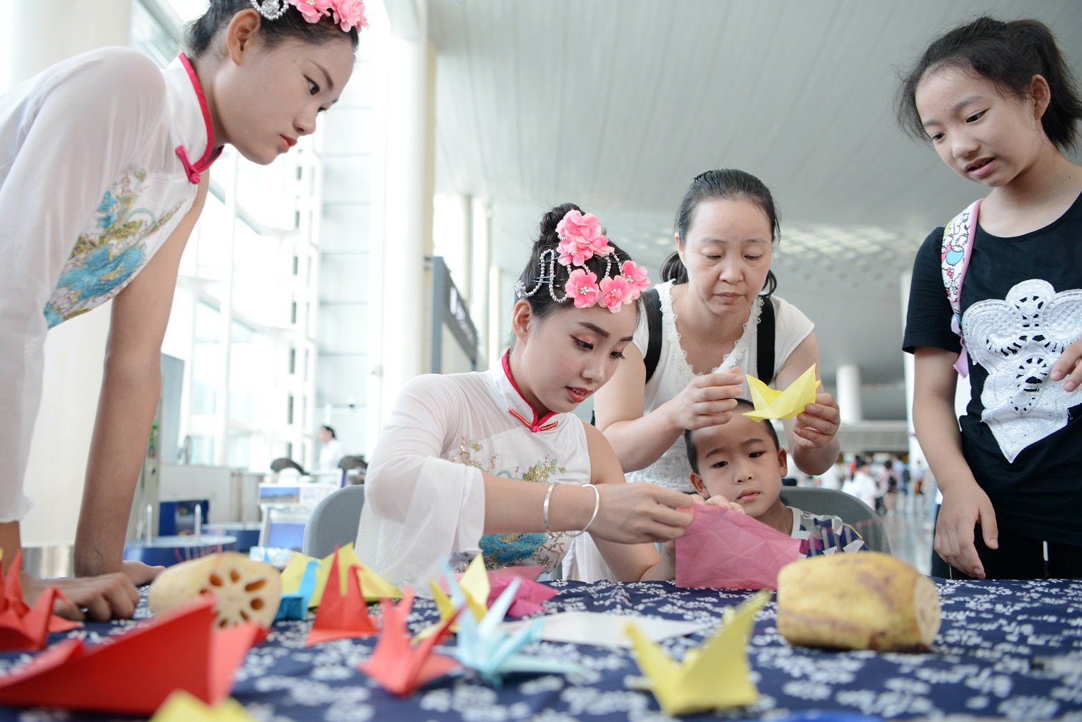 8月7日是中國傳統節日七夕節,在T1出發層9號門旁舉辦了“愛在七夕”傳統文化活動。活動融入了“鵲橋”、“乞巧”等傳統民俗文化元素,身著漢服的“許仙”、“白娘子”為旅客演繹了杭州經典地域元素——“白蛇傳”,并與旅客開展了“紙鶴傳情”和“佳藕天成”等互動游戲,營造了浪漫溫情、內涵豐富的航站樓文化氛圍。