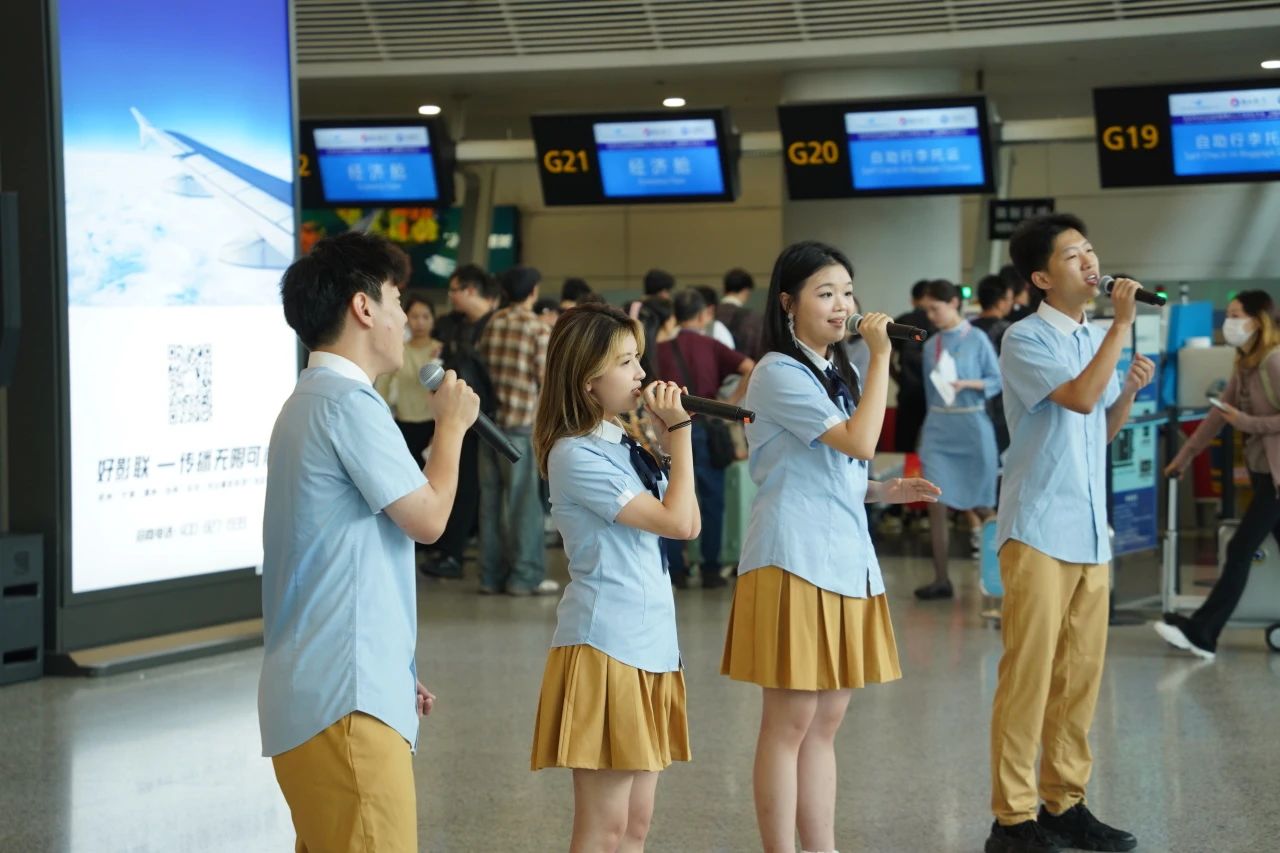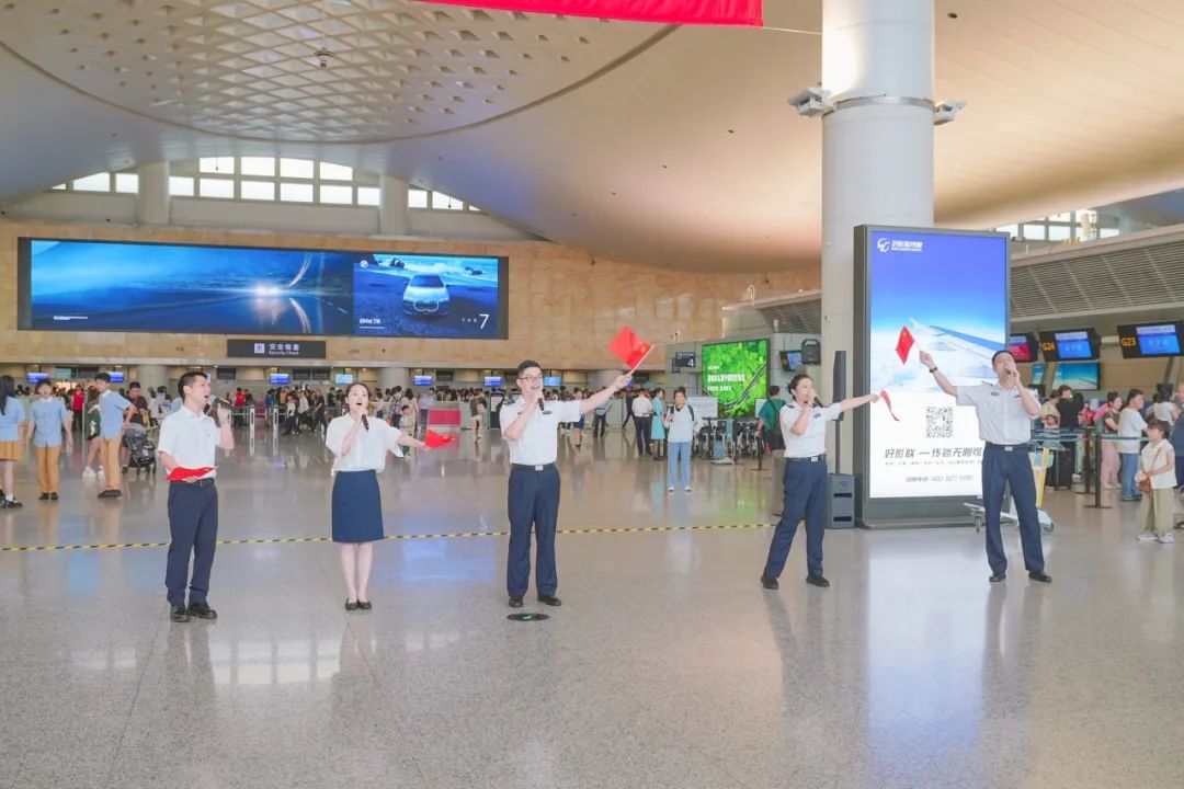 在T4出發大廳中庭的舞臺上,“禮贊偉大祖國”歌詠活動熱烈展開。來自省機場集團和省交通集團的青年宣講員們,正用清朗悅耳、直抵人心的“青春之聲”告白祖國,讓人眼前一亮、心頭一暖。他們談青春感悟、話產業變革、學先輩楷模,從一個個小切口、小場景、小案例出發,娓娓道來、深入淺出,讓蓬勃青春與偉大時代交相輝映。