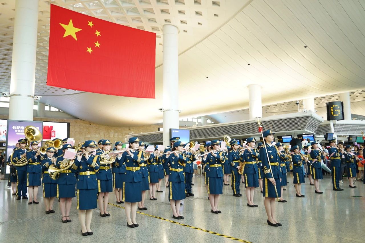 隨后,在一群吉祥物的簇擁下,一支管樂演奏隊伍緩緩走來,從杭州機場T3出發層巡游至交通中心,又巡游至T4出發大廳。隊伍所到之處,一路歡聲一路歌,流動的音樂將對祖國母親的祝福傳遞至杭州機場的每一個角落。