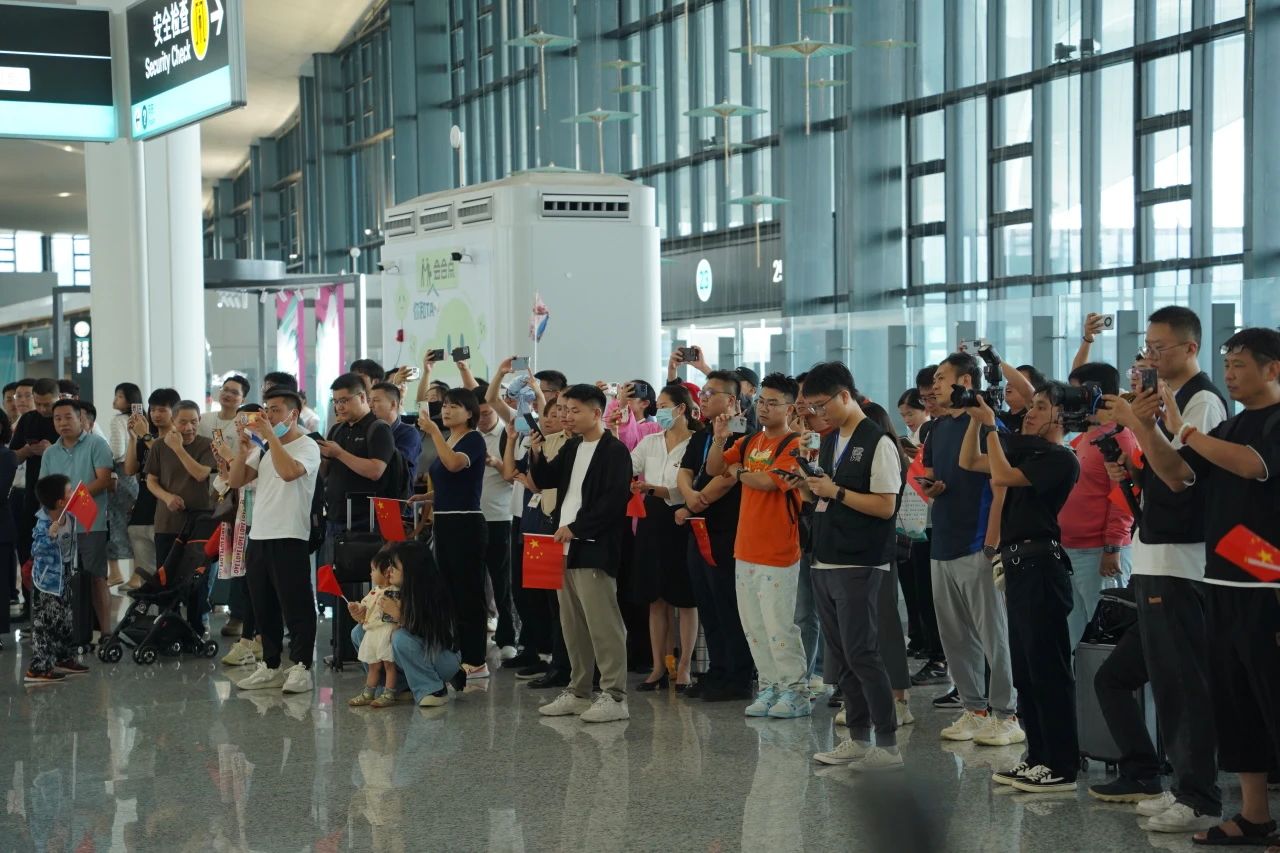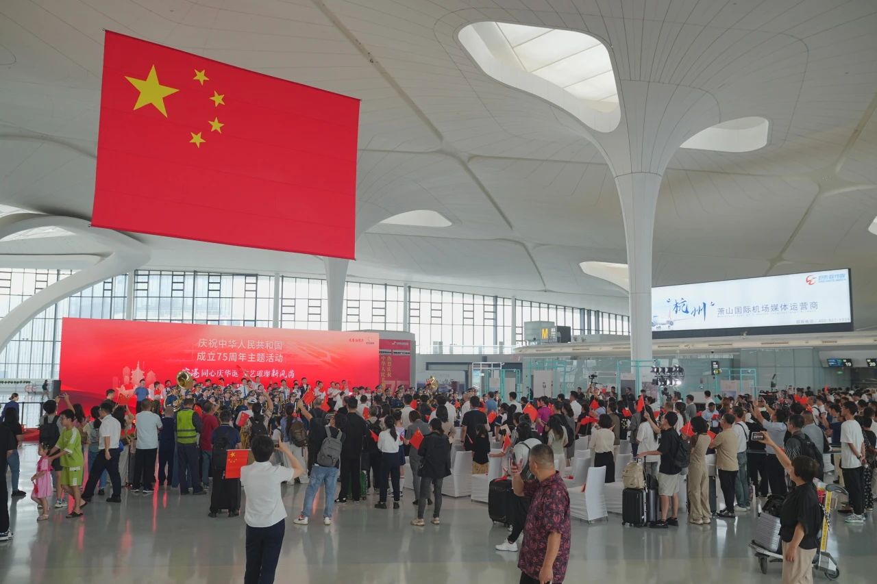 不少旅客掏出手機記錄下這動人心弦的瞬間,來自湖北的旅客葉女士說:“國慶帶著一家人出行,沒想到在杭州機場看到這么精彩的演出,非常振奮人心,為我們偉大的祖國感到驕傲和自豪?!?/p>