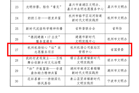 近日,浙江省委宣傳部(省文明辦)公布了2025年全省新時代文明實踐推廣項目名單。航站區(qū)管理中心推送的杭州機(jī)場初心“站”放志愿服務(wù)項目成功入選,成為省屬企業(yè)中唯一獲此殊榮的推廣項目。
