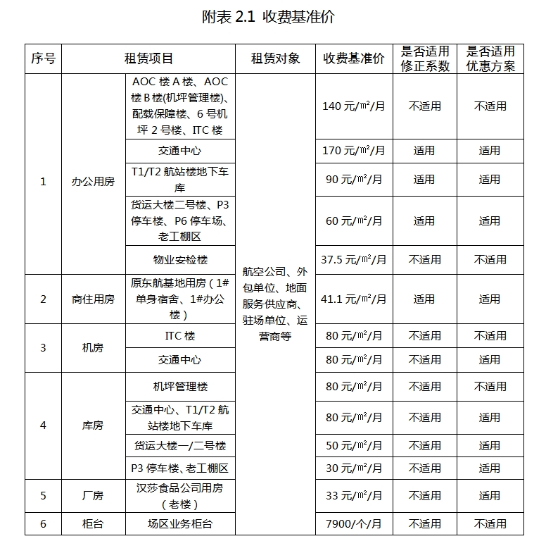 房屋(場地)協議租賃收費標準包含航站樓內和航站樓外兩部分,具體收費標準詳見附件1和附件2。房屋(場地)協議租賃項目應嚴格按收費標準執行。